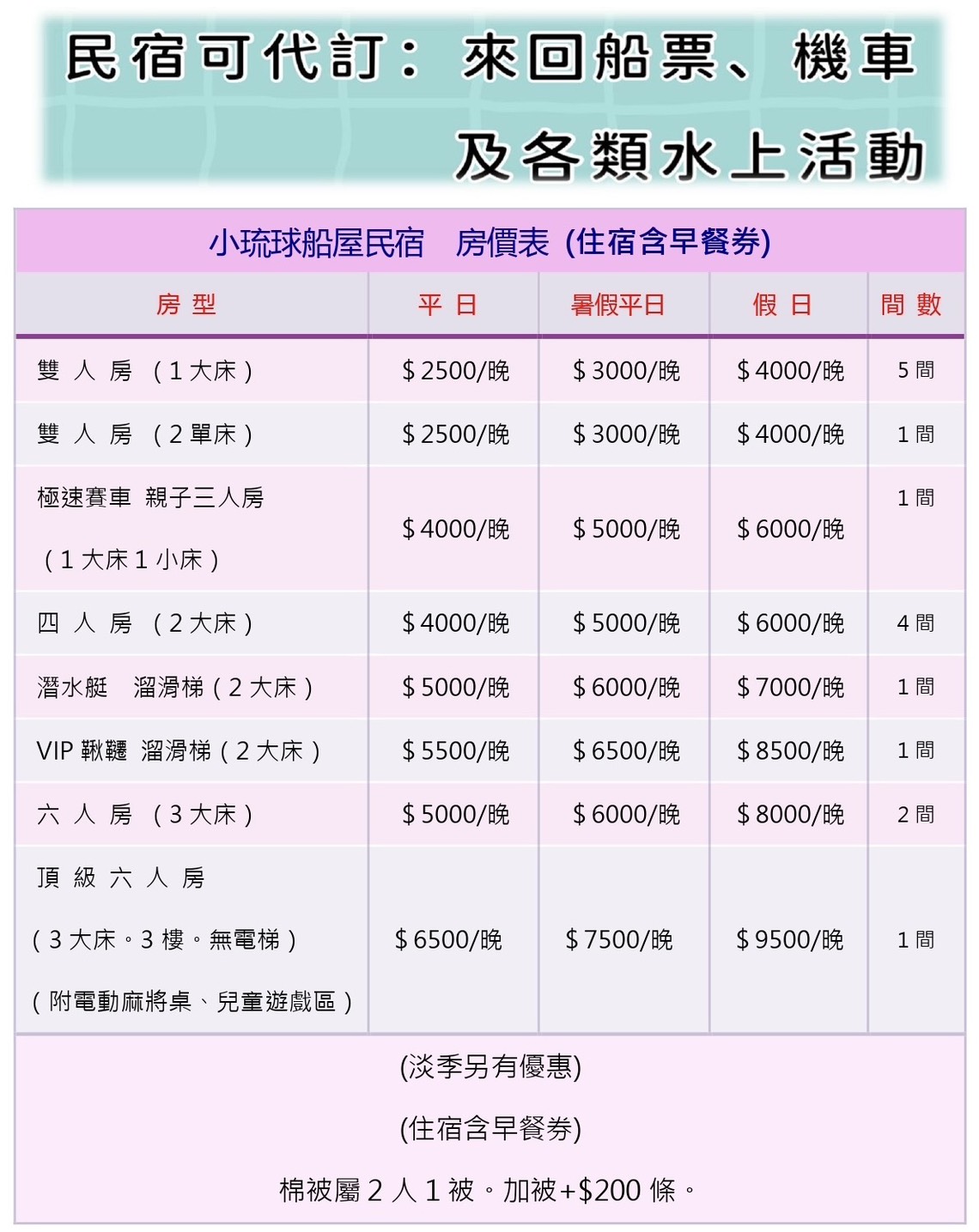1、如超出房型人數,多一人假日、暑平日另收1000元,平日另收800元(皆含早餐券)