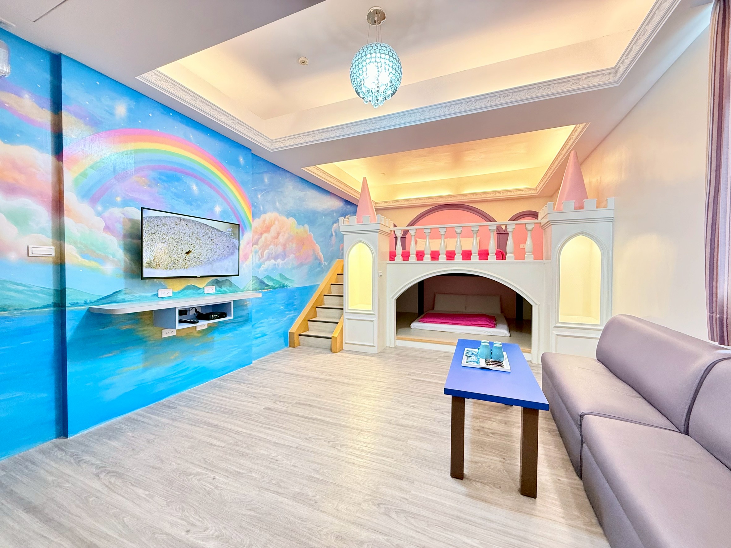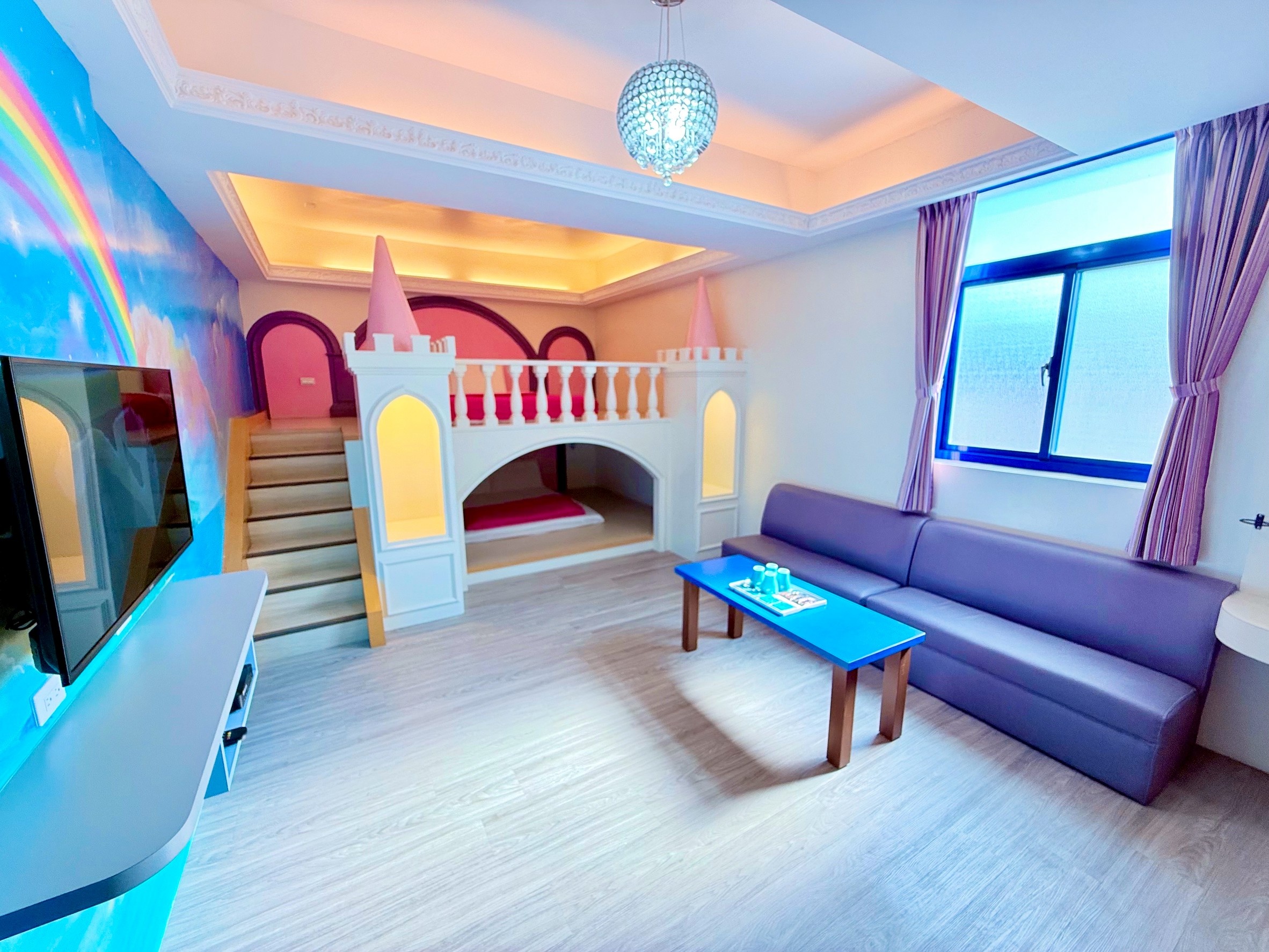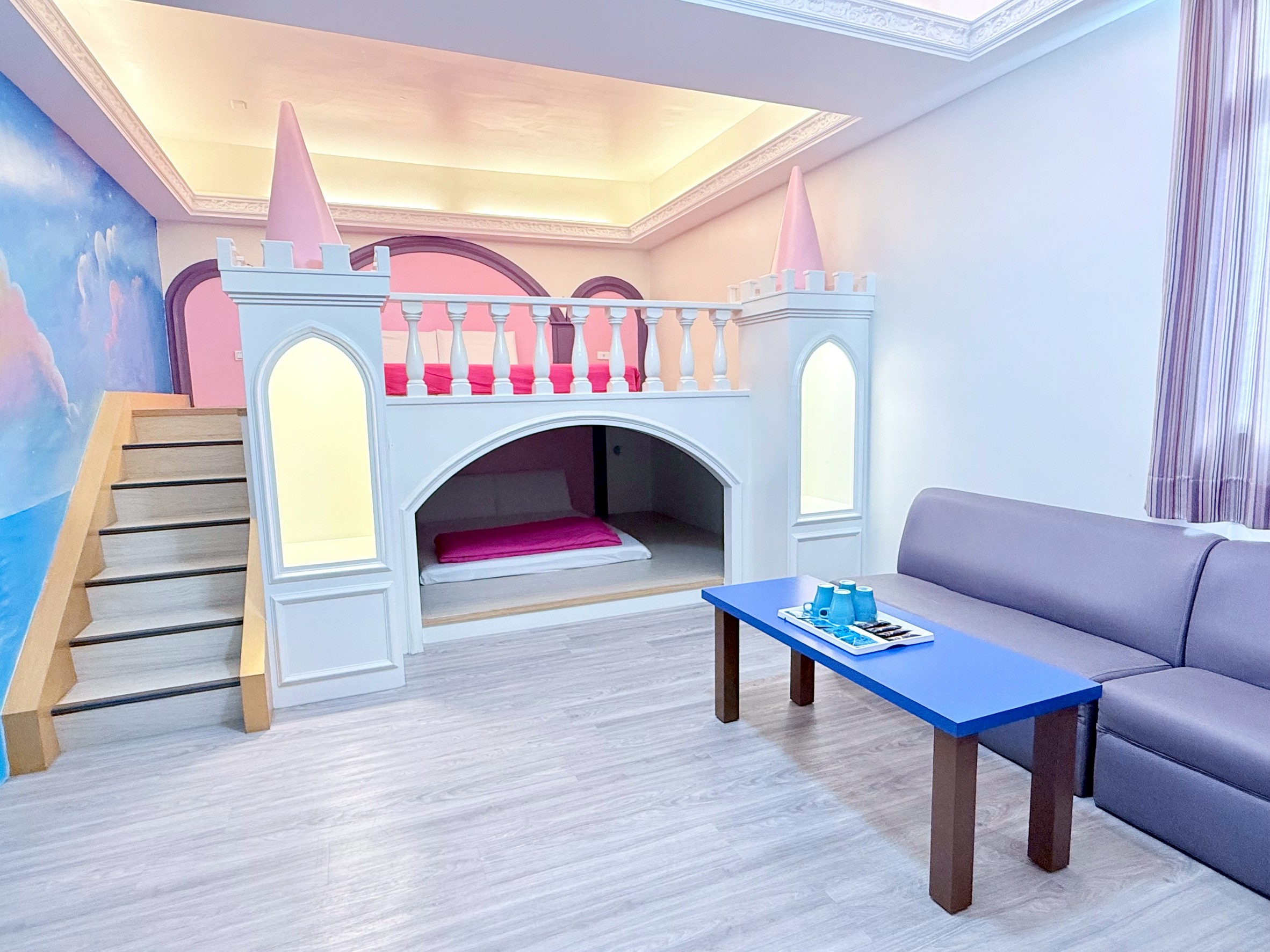 *此房位於2F(無電梯、無溜滑梯),以城堡造型為主題,採上下舖,上層為加床雙人床180*188cm,下層為標準床型150*180cm。